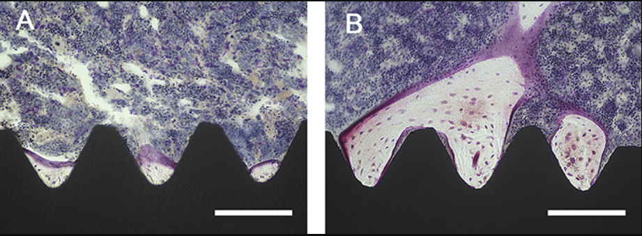 图A和B展示了种植体及其周围骨组织的纵向图像。TNS-MAP种植体表面附着的新骨量大于TNS种植体。术后8周,TNS-MAP 种植体的骨吸收率 (BA) 和骨结合率 (BIC) 均显著高于 TNS 种植体(图C;P < 0.05)[2]。