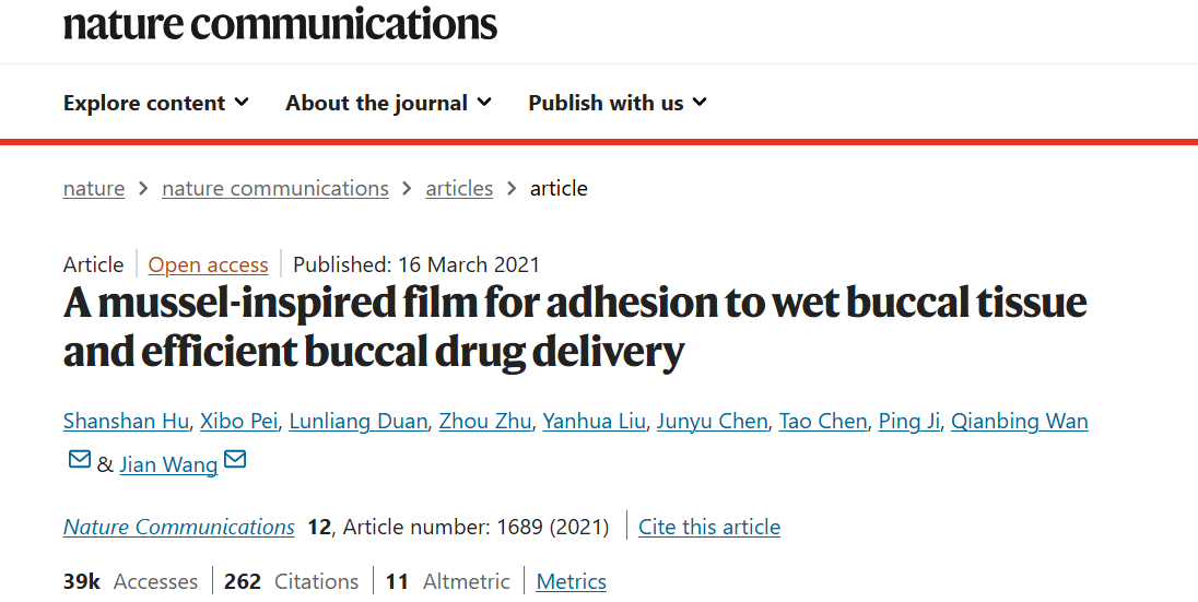 [4] Hu S , Pei X , Duan L ,et al.Author Correction: A mussel-inspired film for adhesion to wet buccal tissue and efficient buccal drug delivery[J].Nature Communications, 2024, 15(1).DOI:10.1038/s41467-024-48275-4.
