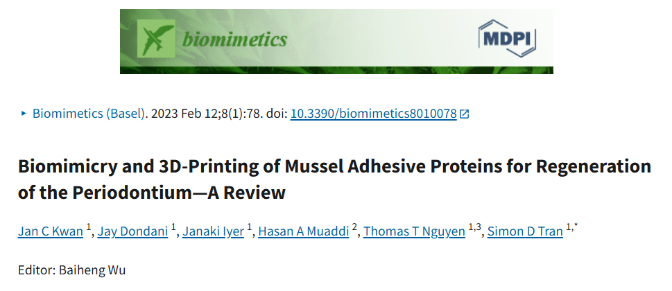 [3] Kwan J C, Dondani J, Iyer J, et al. Biomimicry and 3D-printing of mussel adhesive proteins for regeneration of the periodontium: a review[J]. Biomimetics, 2023, 8(1): 78. doi:10.3390/biomimetics8010078.