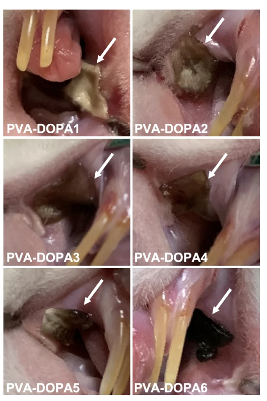 图:不同DOPA含量的PVA-DOPA薄膜在4h后的体内黏膜黏附性。白色箭头:PVA-DOPA薄膜。