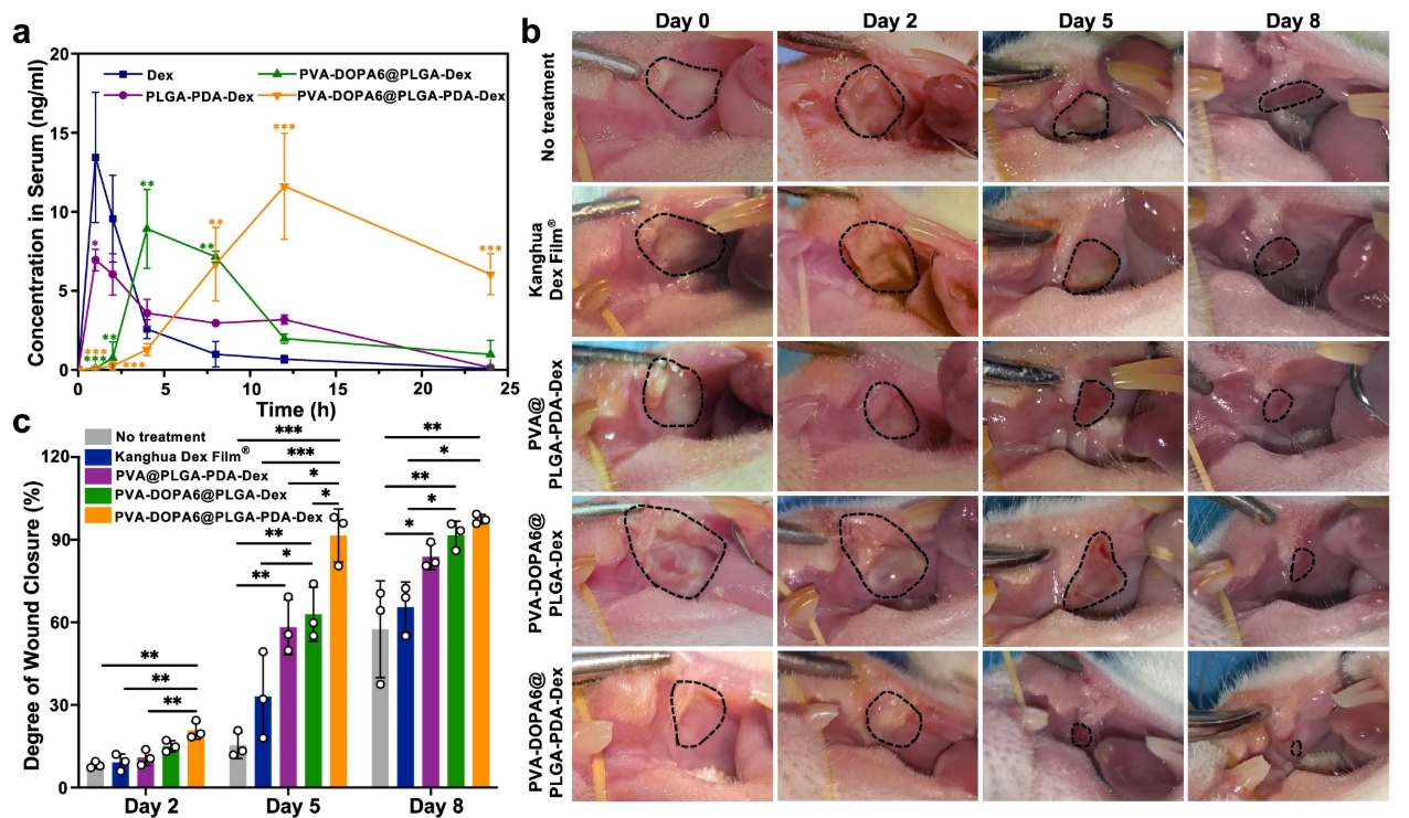通过动物实验证明,该薄膜能够与湿润的口腔组织实现牢固粘附并具有良好的机械匹配性。且该薄膜的粘膜粘附强度和侵蚀速率与DOPA的含量成正比,并可调。同时研究人员将市售康华地塞米松溃疡膜与不同载有地塞米松的PVA-DOPA@NPs薄膜治疗口腔溃疡的疗效进行对比发现,与市售康华地塞米松膜®相比,三种PVA@NPs/PVA-DOPA@NPs薄膜均显示出更好的治疗效果,再次证明了PVA-DOPA在延长薄膜停留时间方面的作用[4]。